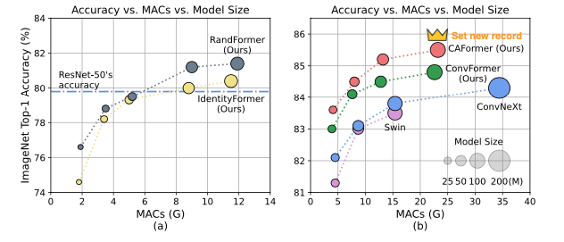 본 논문에서는 Metaformer의 token mixer 부분에 identity / random mixer / convolution / convolution + attention 을 실험하였고, 위 결과를 통해 3가지로 결과를 요약할 수 있다.