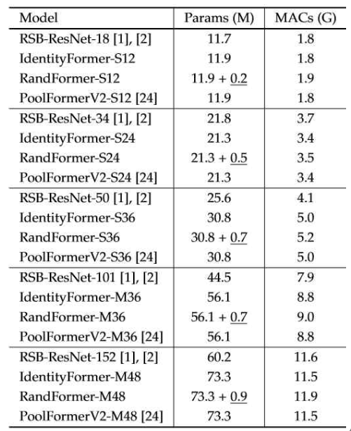 위 표에서 밑줄 친 부분은 RandFormer에서 random value로 초기화되고 freeze된 parameter 부분을 나타낸다. IdentityFormer와 밑줄 친 부분만큼 parameter가 차이나는 것을 확인할 수 있다.