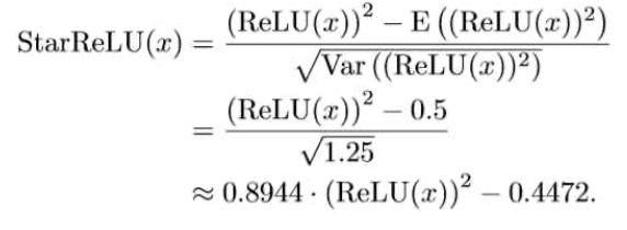 본 논문에서 저자들은 Channel MLP에서 사용되는 activation function을 정의한다. 기존 ViT에서는 GELU function을 사용하는데, GELU의 경우 FLOPs가 14로 기존 방식들에서 사용하던 ReLU, Squared ReLU보다 연산이 훨씬 많이 된다고 한다. 따라서 저자들은 Squared ReLU에서 output의 distribution을 바꾸지 않게 하기 위해 Squarred ReLU의 평균, 분산을 이용하여 StarReLU라는 것을 정의한다. 위 식에서 앞, 뒤의 상수는 learneable parameter로 정의하고 사용을 하도록 한다.