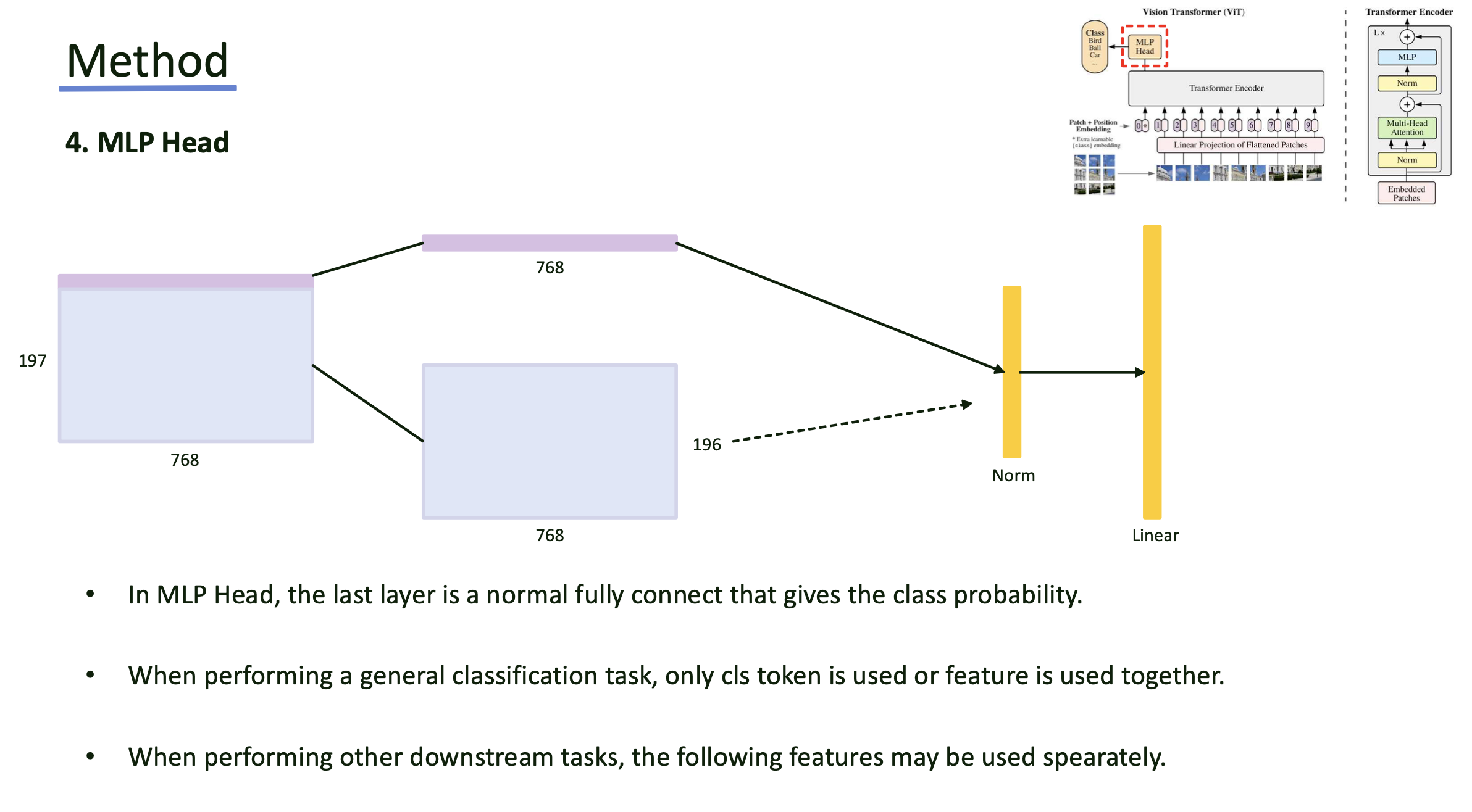 - Encoder를 거친 뒤 나온 feature vector에서 제일 앞에 붙였던 [CLS] 토큰에 대해 normalization, MLP layer를 거쳐 classification을 진행할 수 있음.