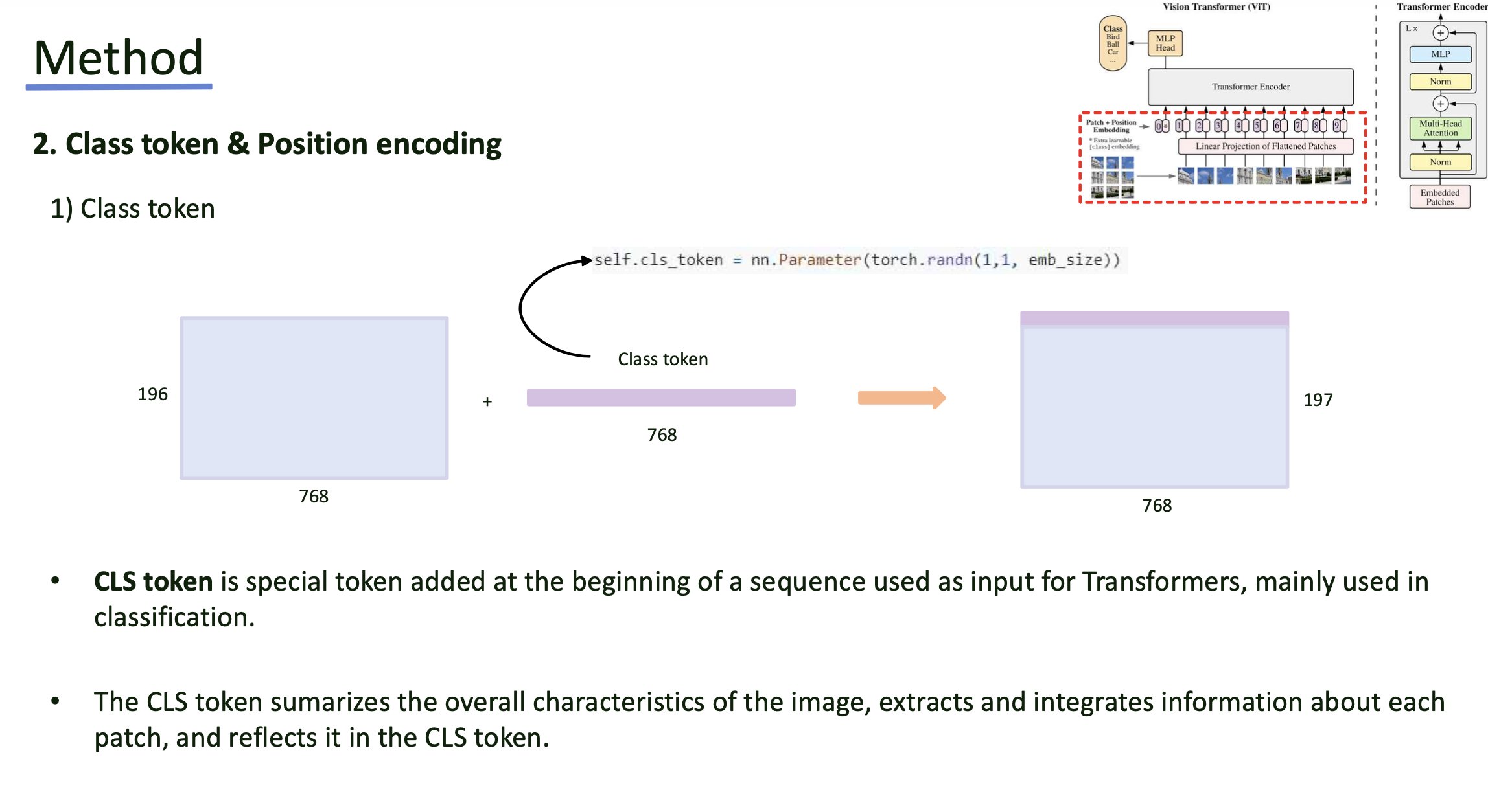 - Position encoding은 patch의 위치 정보를 보존하기 위해 각 토큰에 더해짐.