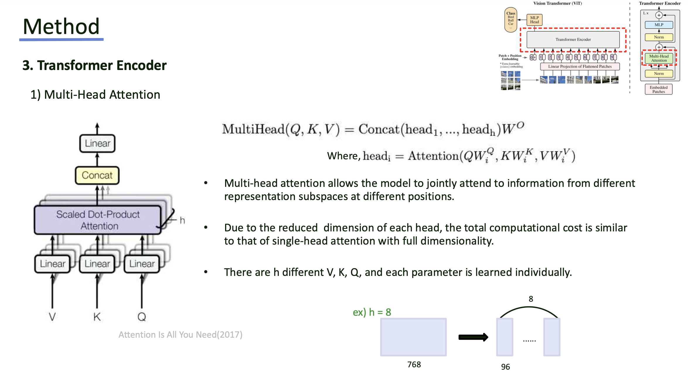 - Sequence에 대해서 Query, Key, Value를 생성하게 되며, Head별로 나누어 Attention 연산을 적용.