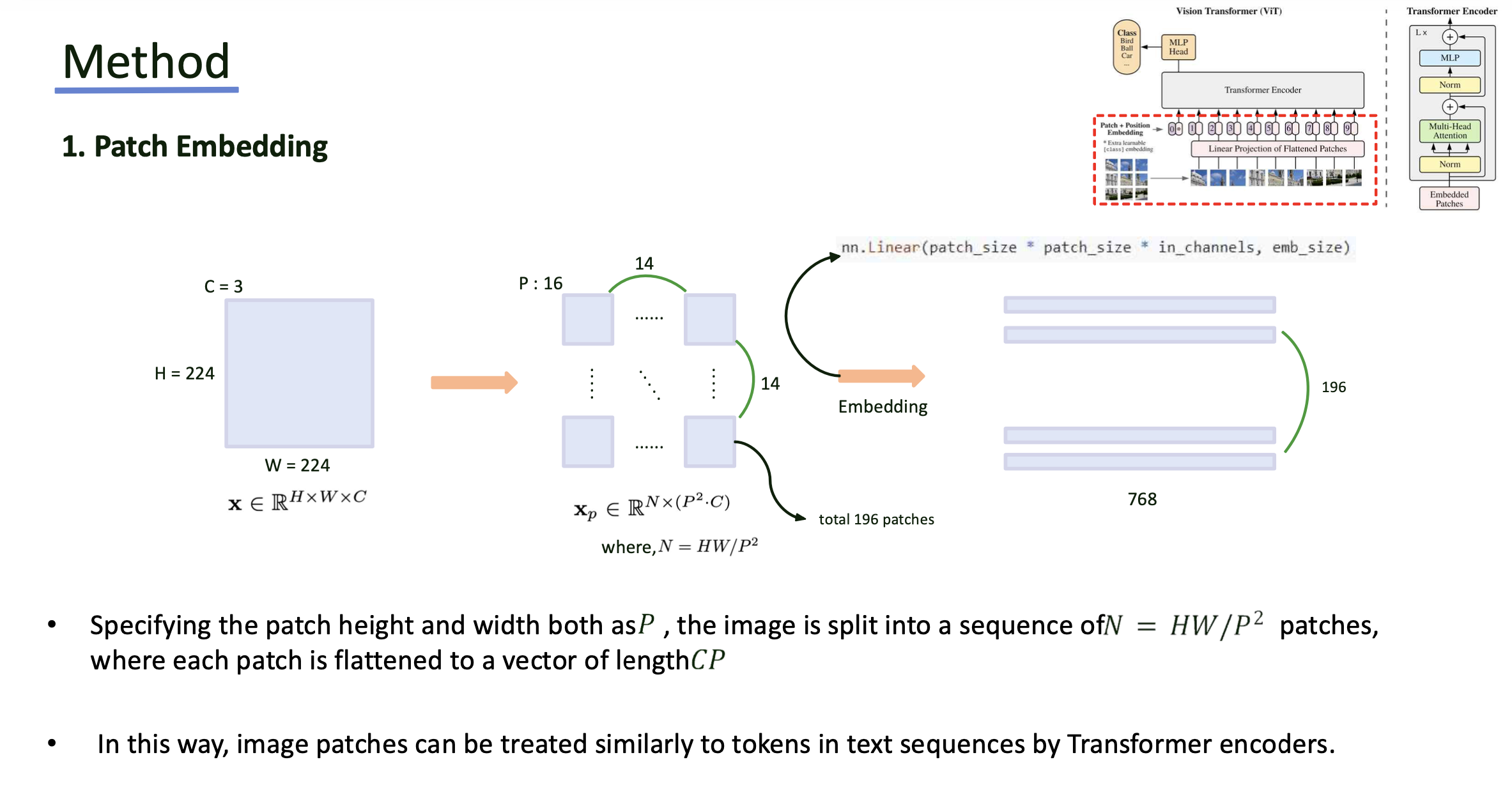 - 각 patch는 flatten하여 P2×C의 벡터xp로 변한한 뒤, linear projection을 통해 embedding을 진행. 이 때 dimension은 768차원으로 변환.