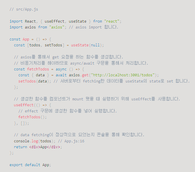 콘솔로 결과를 확인하니, 우리가 생성한 Todos를 정상적으로 서버에서 가져와서 state가 set 한 것을 확인할 수 있다.