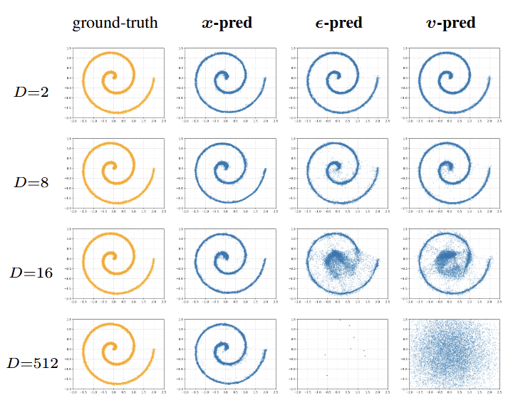 위 Figure는 논문의 Toy Experiment 결과로, "왜 픽셀 공간(pixel space)에서 노이즈를 예측하면 안되는가"를 간단한 실험(265차원 은닉 유닛을 갖는 5-layer ReLU MLP의 간단한 생성 모델을 학습에 사용)으로 직관적으로 증명한다.