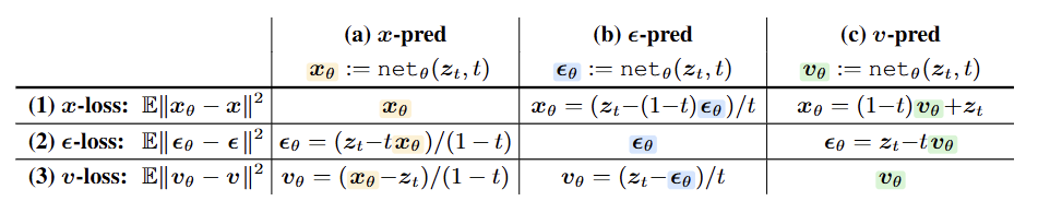 대다수의 Diffusion model은 노이즈()가 섞인 이미지에서 이 ""가 무엇인지를 예측하거나, 노이즈와 데이터가 섞인 "-prediction" 값을 예측하도록 학습된다.