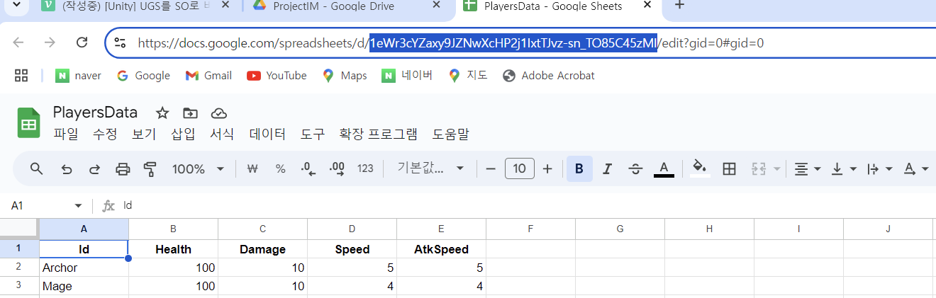 다음과 같이 인스펙터에 표시되게 되는데 DocumentId에 구글 시트 주소를 넣으면 된다.