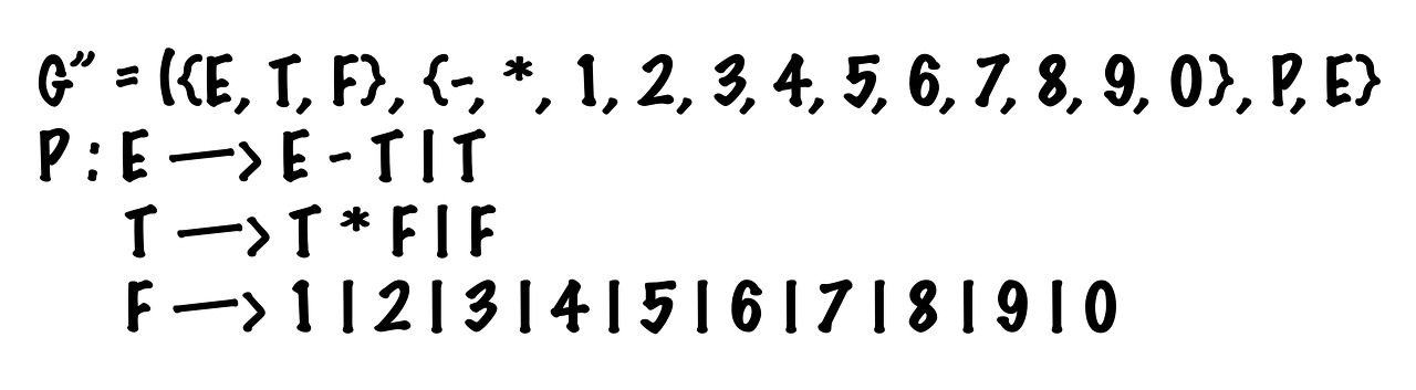 left-associativity를 고려하여 문법 G'을 G''으로 바꾸면 다음과 같다.