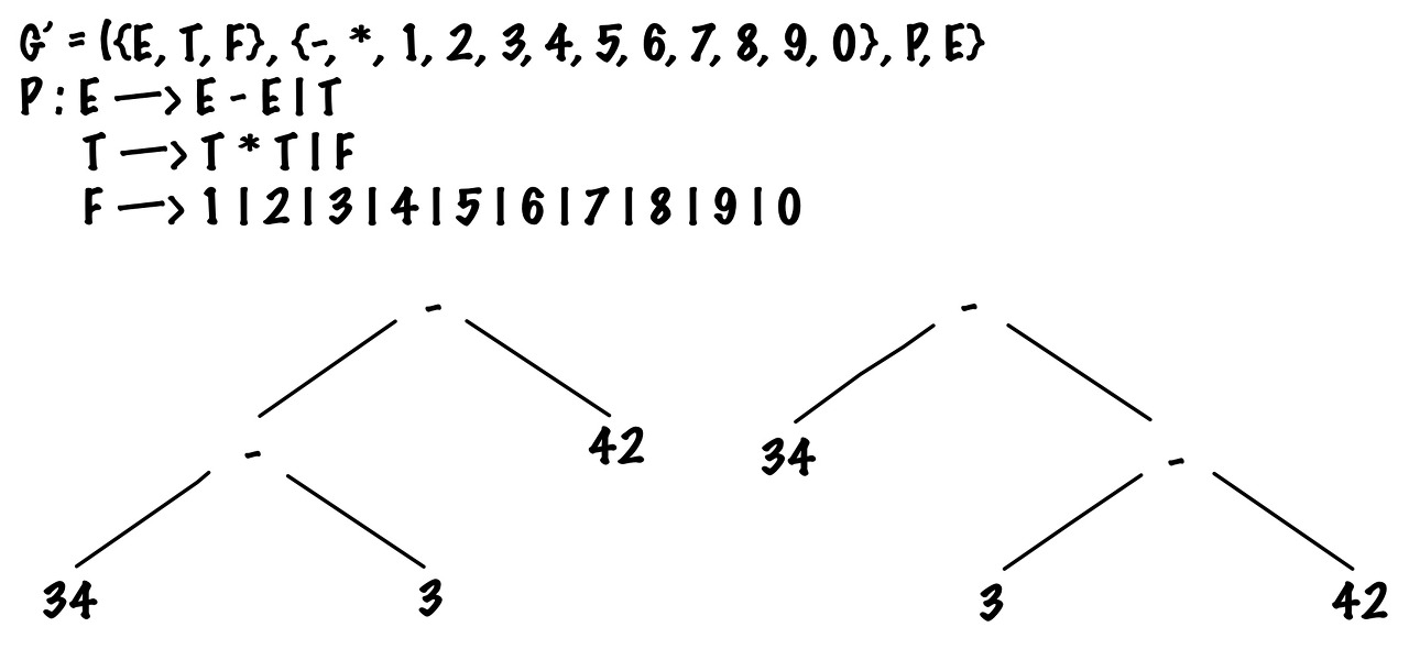 연산자 우선 순위를 고려했음에도 불구하고, 문법 G'로 34 - 3 - 42에 대해 두 가지 파스 트리를 생성되며 그 결과 역시 다르다.