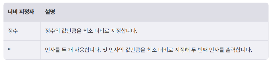 최소 너비를 지정하며, 치환되는 문자열이 이 값보다 짧을 경우, 공백 문자를 문자열 앞에 패딩한다.