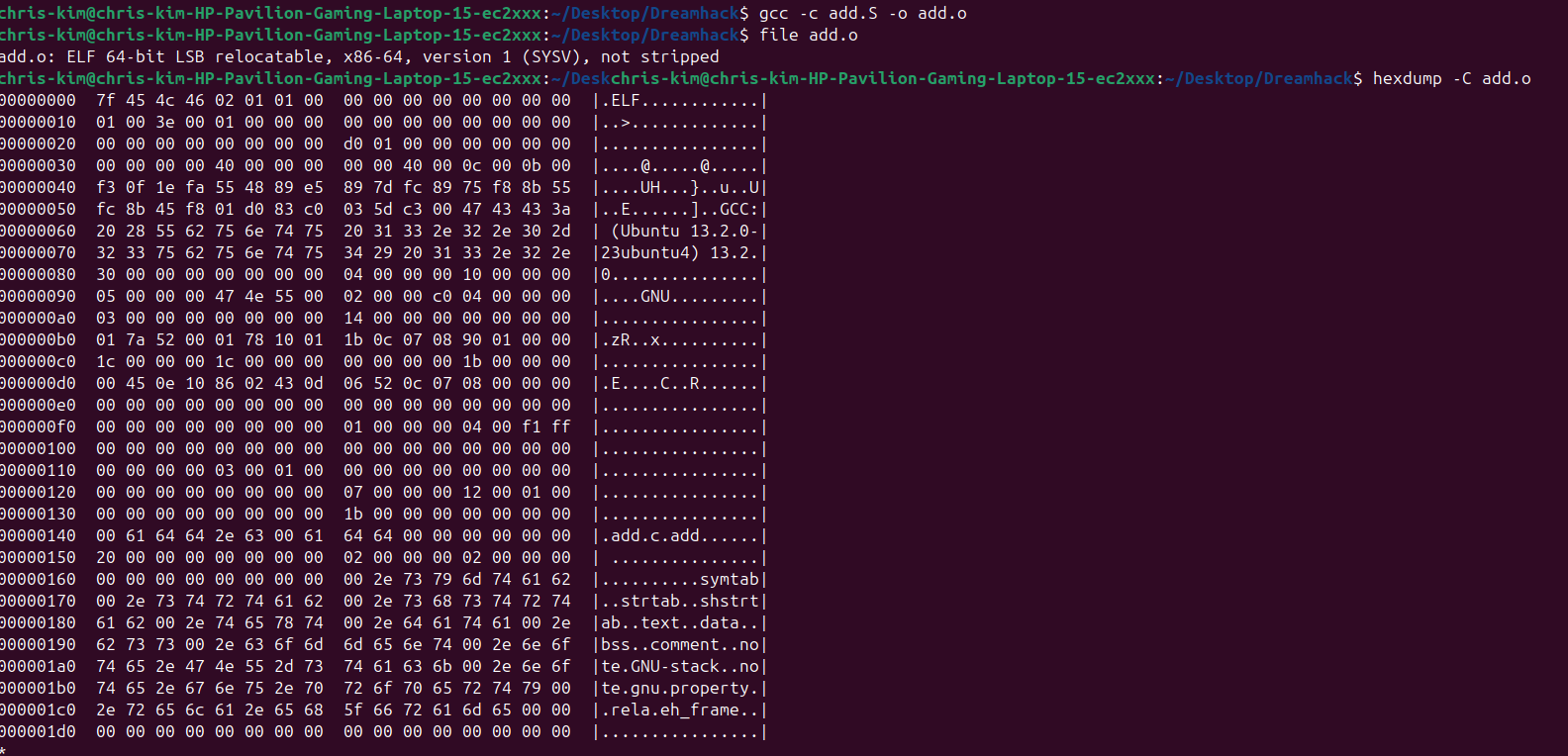 목적 파일로 변환되면 어셈블리 코드는 기계어로 번역된다. 다음은 add.S를 목적파일로 면환하고 16진수로 출력하는 장면이다.
