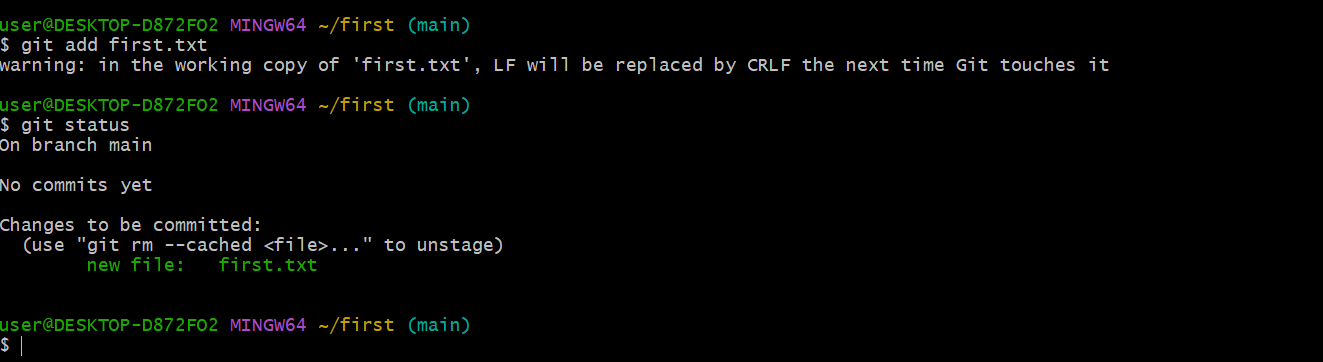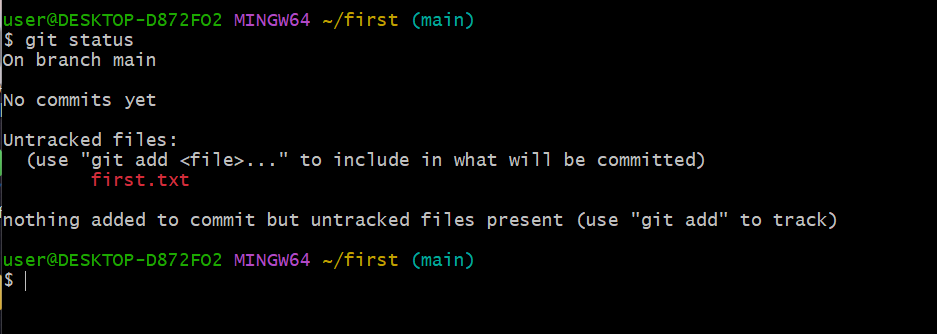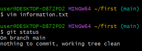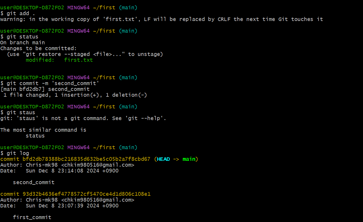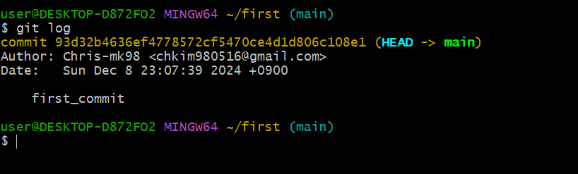 git status로 커밋이 이뤄진 것을 확인할 수 있다.