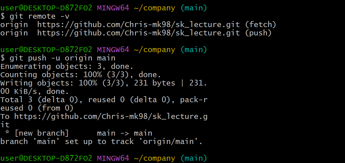 remote add origin <주소>,push실행(처음에는git push -u origin main)