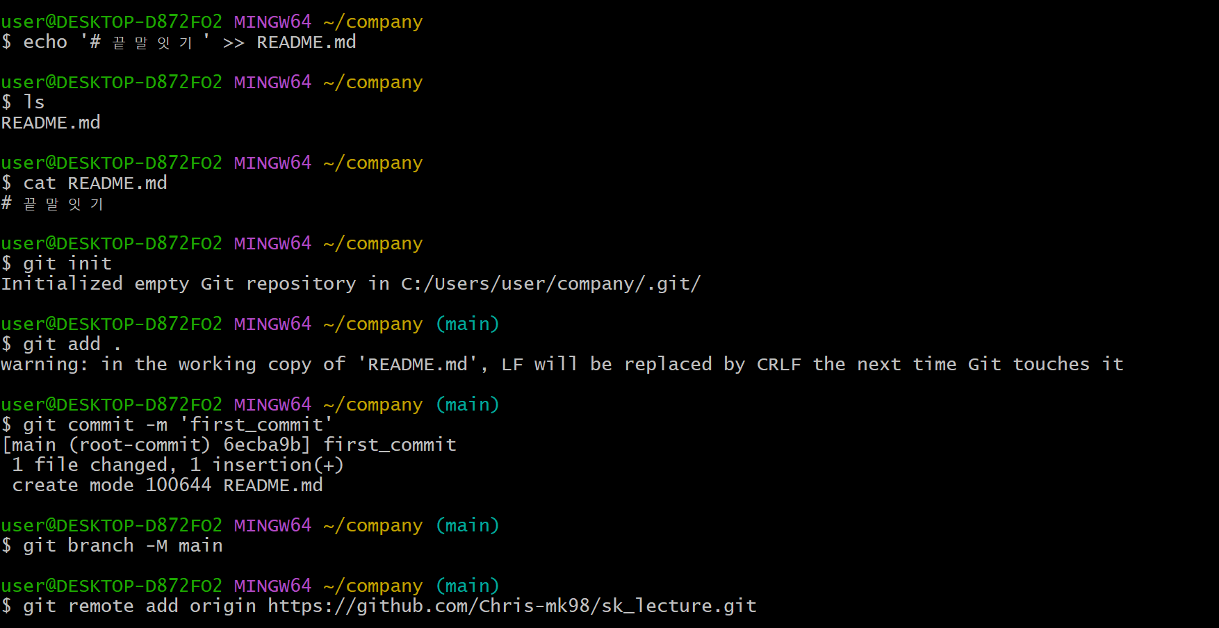 - 프로젝트 폴더에 github 저장소 주소 설정: