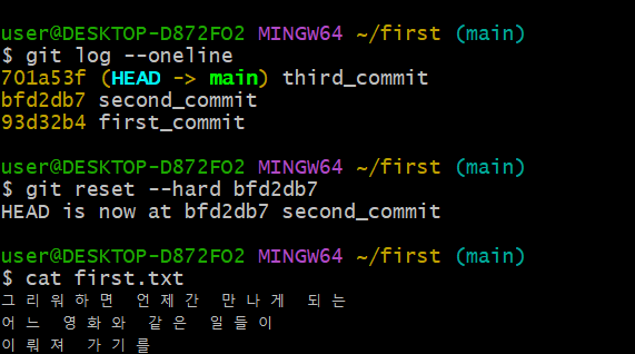 --hard: 해당 커밋 직후 상태로 복구(해당 커밋 이후 파일 변경은 반영 안됨)