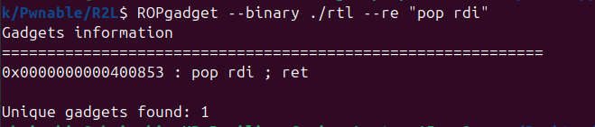 system 함수의 PLT 주소를 안다. -> system 함수를 호출 할 수 있다.리턴 가젯(Return gadget) 이란 ret 명령어로 끝나는 어셈블리 코드 조각을 말한다. ROPgadget --binary rtl를 사용해서 가젯을 구할 수 있다.