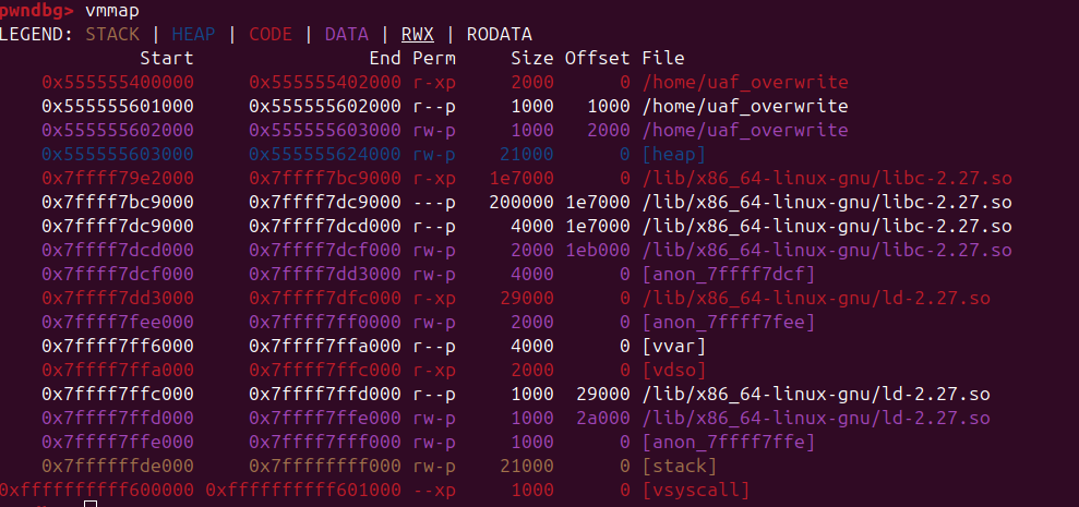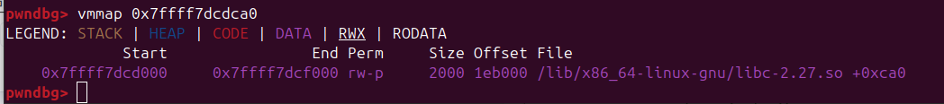 fd와 bk에 0x7ffff7dcdca0이 저장되어있다. vmmap로 살펴보자.