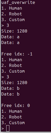 Robot과 Human은 크기가 같으므로 서로 다른 하나를 할당 후 해제하면 UAF가 발생할 수 있다. 잘 보면 human_func와 robot_func 둘 다 할당한 메모리를 초기화하지 않는다.
