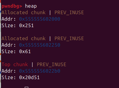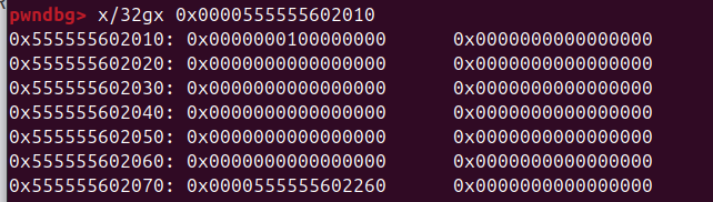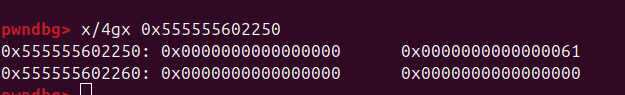 0x555555602250가 malloc(0x50)으로 할당된 청크의 주소다. 이 메모리 값을 덤프해보면 아무런 값도 없는 것을 확인할 수 있다.