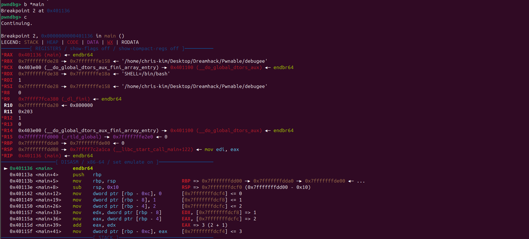 rip부터 여러 줄에 걸쳐 디스어셈블 결과를 보여줌rsp부터 여러 줄에 걸쳐 스택의 값을 보여rip에 도달할 때까지 어떤 함수들이 중첩되어 호출되었는지 보여줌.일반적으로 main함수가 주 기능들을 수행하므로 main함수가 분석 대상이 된다. 하지만 main 함수까지 일일이 한 줄씩 실행하는 것은 효율적이지 못한 디버깅이다. 따라서 중단점(breakpoint)를 설정하고 continue를 활용한다. b *main이라고 입력해서 main함수에 중단점을 설정하고 c를 입력해서 continue를 실행 시키면 main 함수 위치에서 멈춘 것을 볼 수 있다.