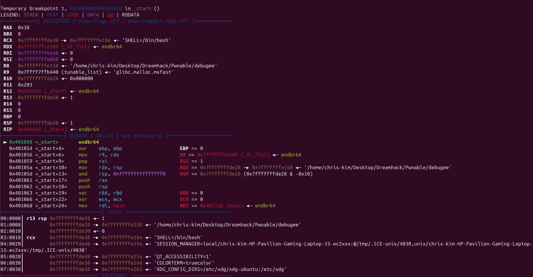 02:0010│ 0x7fffffffc238 —▸ 0x7fffffffc308 —▸ 0x7fffffffc557 ◂— '/home/dreamhack/debugee'