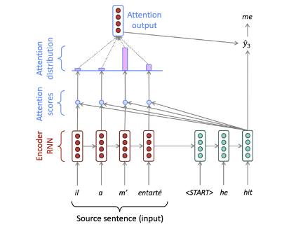 encoder hidden state 가 value 이므로, 이를 attention distribution 과의 weighted sum 을 통해 attention output 을 얻는다.