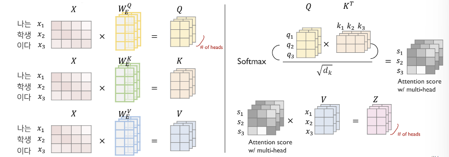 X ∈ ℝ^{batch_size × seq_len × d_model} 형태로 임베딩.Multi-Head Attention