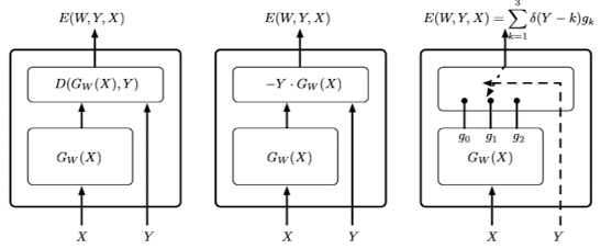 (c) Multiclass classifier: The discriminant function produces one value for each of the three categories. The answer, which can take three values, controls the position of a "switch", which connects one output of the discriminant function to the energy function. The best inference is the index of the smallest output component of .