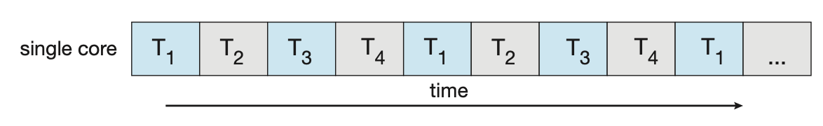 단일 컴퓨팅 코어가 있는 시스템에서는 단지 처리 코어가 한 번에 하나의 스레드만 실행할 수 있기 때문에 병행성(Concurrent)은 시간이 지남에 따라 스레드 실행이 인터리브 됨을 의미합니다.