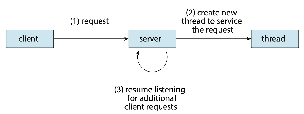 예시로 운영체제 커널도 다중 스레드입니다. 리눅스 시스템에서 각 스레드는 장치관리, 메모리 관리 또는 인터럽트 처리 같은 자겁을 수행할 수 있습니다.