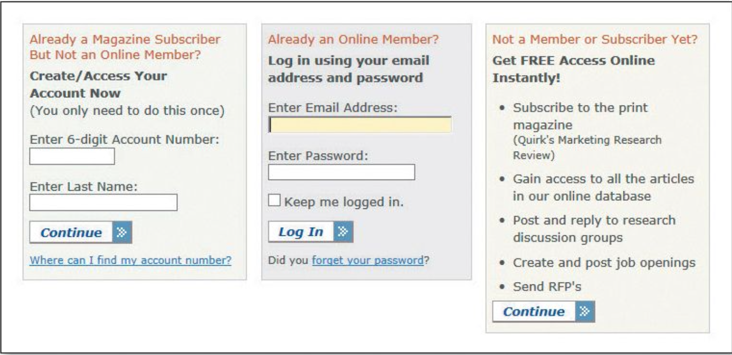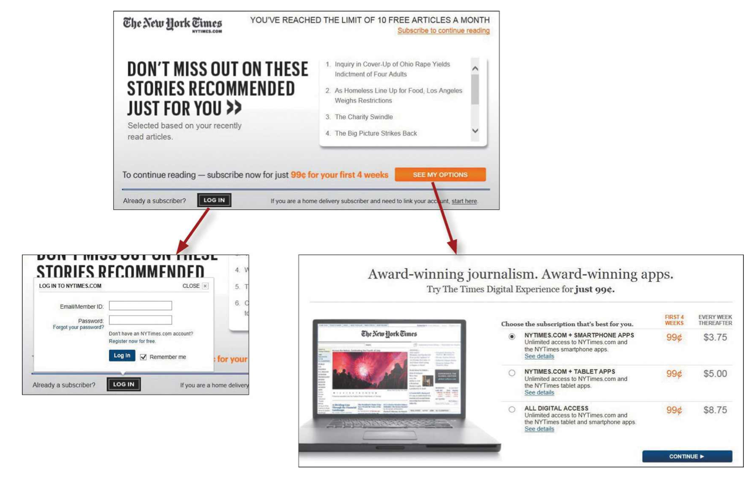 - Making an initial selection (to log in or to see your options for subscribing)