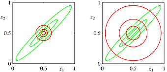Variational inference는 위에서 설명한 factorized approximation 기반인데 이 방법도 문제가 있다. 그 문제를 이제 예를 통해서 확인해보자. 만약 실제 문제에서는 우리가 알 수 없지만 실험에서 p(X,Z)를 알고 있다고 하자. 이 실험에서는 데이터 X가 없으므로 그냥 p(Z)라고 하겠다. p(Z)=N(Z;μ,Λ−1)이고 Z=(z1,z2)를 확률변수로 갖는 이변량 정규분포의 모수들은 각각 아래와 같다.