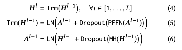 SASRec과 마찬가지로 BERT4Rec에서도 residual connection, layer normalization, droupout을 적용한다. 수식은 아래와 같다.