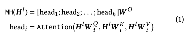 다양한 위치에서 다른 표현 subspaces의 정보를 공동으로 주목하다는 것이 유익하다는 연구들에 영감을 받아 이 논무에서는 single attention이 아니라 multi-head self-attention을 채택한다. 이 방법에 대한 것은 Section 4에서 figure로 보기 좋게 설명해준다. 수식은 아래와 같다.