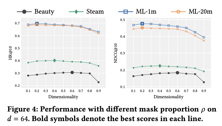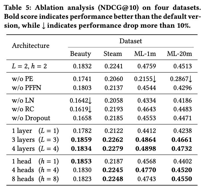 attention은 layer마다 다르다. layer 2 (c, d)는 더 최근의 item에 집중하는 경향이 있다. 이것은 layer 2는 ouput layer와 직접 연결되어 있고, 최근 item이 미래 예측에서 더 중요한 역할을 하기 때문이다. 또 다른 흥미로운 패턴은 (a)와 (b)에서 mask에 주의를 기울이는 head이다. 이것은 self-attention이 sequence-level state를 item-level로 전달하는 방법일 수 있다.
