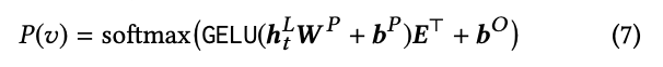 Figure 1b와 같이 time step t에서 item vt를 masking 한다고 하면 ht의L을 기반으로 masking된 item vt를 예측한다. 구체적으로 말하면 2개의 layer feed-forward network에 GELU를 적용하여 target item에 대한 output distribution을 생성한다. 수식은 아래와 같다.