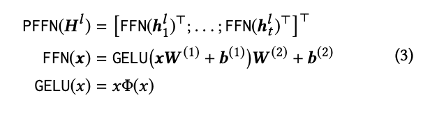SASRec과 마찬가지로 위에까지의 수식은 linear model이다. 여기서도 non-linear 모델로 만들기 위해 Position-wise Feed-Forward Network를 적용한다. parmeters는 모든 위치에 걸쳐 공유된다. SASRec과의 차별점으로는 ReLU 대신 더 부드러운 GELU를 사용한다는 특징이 있다. 수식은 아래와 같다.