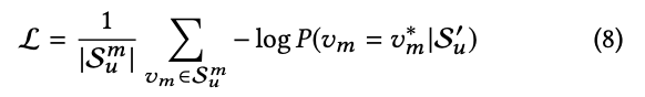 loss는 아래와 같은 수식으로 표현된다. S'u는 user behavior histort Su의 masking된 것이고, Su의m은 random masking된 item들, vm의*은 masking된 Item vm에 대한 실제 item이다.