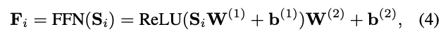 여기까지의 연산은 linear model이다. 이 논문을 떠나서 딥러닝이 크게 성공할 수 있었던 가장 큰 이유 중에 하나는 non-linear funtiond을 통해서 모델을 non-linear하게 만들었기 때문이다. 여기서도 마찬가지로 모델에 nonlinearity을 부여하고 다양한 latent dimensions간의 interactions를 고려하기 위해 모든 Si에 대하여 동일하게 point-wise feed-forward network를 적용한다 (parameters는 공유). 더 자세히 말하면 모든 Si를 독립적으로 각각 FFN을 하는 것이다. 다시 말해 Si와 Sj간의 interaction은 전혀 없다. 이는 information leaks (정보가 뒤에서 앞으로 새는 것)를 방지한다는 의미이다. 수식은 아래와 같다.