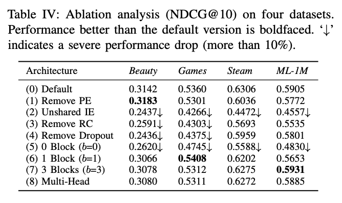 (a) vs (c) -> sparse한 Beauty dataset은 더 최근의 item에 주의를 기울이는 경향이 있고, dense한 ML-1M dataset에서는 덜 최근의 아이템에도 주의를 기울이는 경향이 있다. 이것을 통해 알 수 있는 것은 SASRec이 spase, dense dataset에 맞게 적응적으로 처리되는 것을 보인다는 것이다.