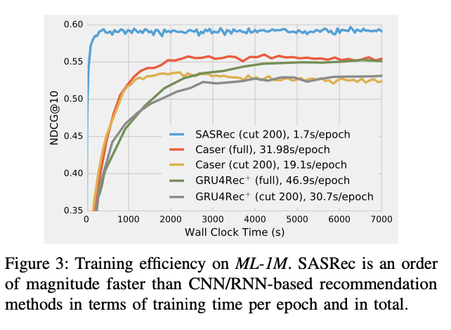 SASRec의 핵심 구성 요소인 self-attention block은 parallel acceleration에 적합하여 CNN/RNN 기반의 모델보다 더 빠르게 작동한다.