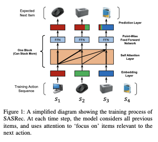 이 2가지 방법의 문제점을 해결하기 위해 이 논문에서 제안하는 것이 NLP 분야의 Transfomer를 가져오는 것이다. Transfomer는 self-attention이라는 mechanism을 사용한다. 이것은 문장 내 단어들 사이의 syntactic, semantic pattenrs를 발견하는데 효율적이다. 여기에 영감을 받아서 Self-Attention based Sequential Recommendation model (SASRec)을 구축한다.