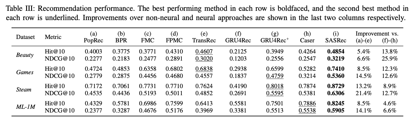 SASRec은 MC/CNN/RNN-based sequential recommendation methods를 능가한다. SASRec은 dense한 데이터셋은 long-range dependencies를 고려하는 경향을 보이고, sparse한 데이터셋은 최근 활동에 집중하는 모습을 보인다. 이는 SASRec 다양한 density의 데이터셋을 적응적으로 처리한다고 볼 수 있다 (Section 4 참고).