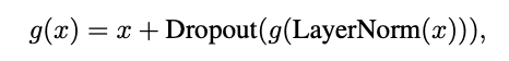 그러나 network가 깊어질수록 overfitting, vanishing gradients, more training time과 같은 문제점들이 발생한다. 이를 해결하기 위해 아래와 같은 수식을 추가한다. g(x)는 self-attention layer 또는 feed-forward network를 나타낸다. 각 block의 layer g에 대하여 input x에 layer normaliztion을 적용한 후 g에 넣고 그 output을 dropout에 적용한 다음에 final output에 x를 더한다.