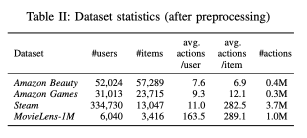 dataset의 train-validation-test를 split하는 방법은 가장 최근 action이 test set, 두번째로 최근 action이 validation set, 나머지 모든 action은 test set이다.