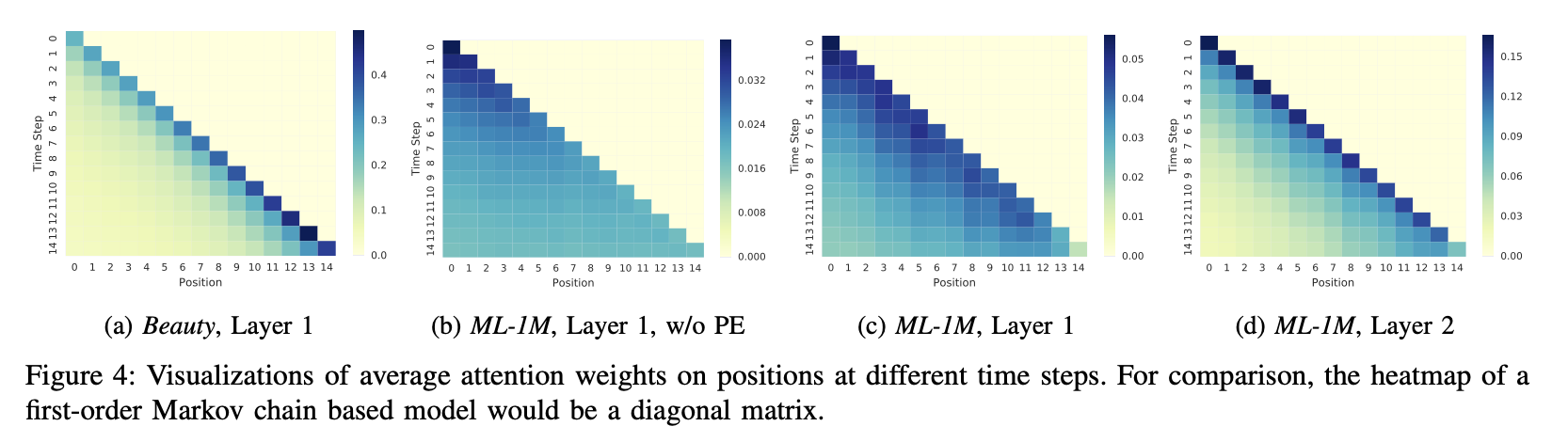 (b) vs (c) -> Position Embeddings (PE)의 효과를 보기에 적합한 비교이다. (b)는 균등하게 분포되는 반면에 (c)는 위치에 더 민감하여 최근 아이템에 더 주의를 기울이는 경향이 있다.
