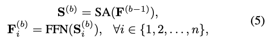 위에까지의 수식으로 first self-attention block 이후의 Fi는 본질적으로 모든 이전 item들의 embeddings를 aggregates한다. 여기서 더 complex하게 하기 위해서 self-attention block을 F 기반으로 쌓는 것이 유용할 수 있다. 구체적으로 self-attention block (self-attention layer, feed-forward network)을 쌓는다. b번째 (b > 1) block은 아래 수식과 같이 정의한다.