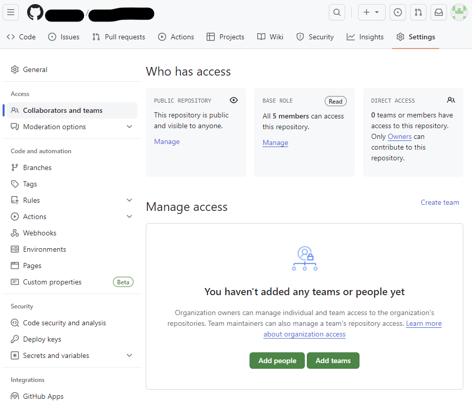 - Outside collaborators(외부 공동 작업자) : Organization과 직접적으로 연결된 멤버가 아니지만, 특정 저장소(repository)에 대한 액세스 권한을 가진 개인을 말함