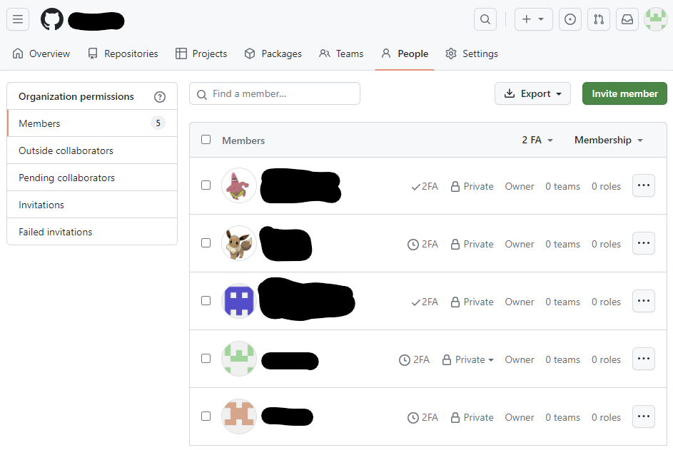 - Pending collaborators (대기 중인 공동 작업자) : 조직에 초대를 받은 개인 중에서 아직 초대를 수락하지 않은 사람들을 말함
