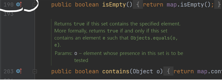 만약 구현한 코드이거나 상속한 코드인 경우 코드 줄 숫자 오른쪽에 화살표 모양으로 Overriding 되었다는 표시가 뜬다.
